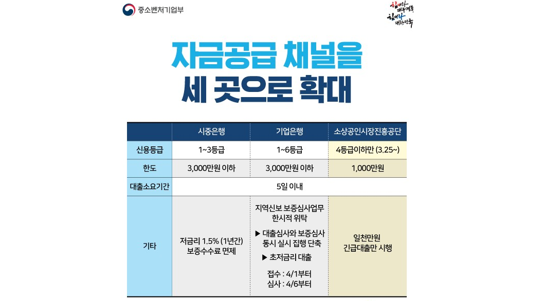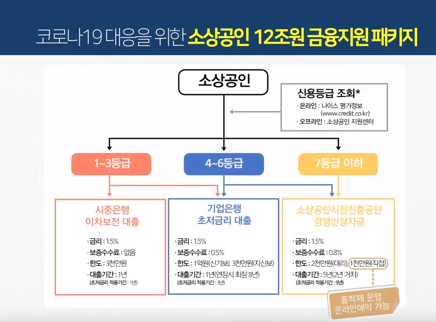 대출 창구도 시중은행으로 통일되는데 1단계 프로그램은 신용등급에 따라 대출 창구가 나뉘어 있었는데 4~10등급은 소상공인지원센터, 4~6등급은 기업은행, 1~3등급은 시중은행에서 각각 대출 신청이 가능했는데 긴급대출이라는 명칭에 어울리지 않게 사람이 많이 몰려 엄청 오래 걸렸는데요. 그래서 이번에 금융위는 인프라가 열악한 소진공 대출 창구를 2단계부터는 없애고 시중은행으로 통일하기로 한 거라고 전하고 있습니다. 이건 확실히 잘한 조치라고 생각됩니다. 생각보다 많이 늦어진다고 푸념이 많았거든요.