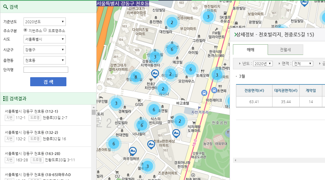 여러가지 기능들이 있는데 아파트 실거래가만 보고 가면 섭섭하니 옆에 있는 연립 / 다세대 쪽을 클릭하여 넘어온 모습인데요. 기준년도는 2020년을 맞추고 서울특별시 강동구 천호동을 기준으로 검색을 해봤는데요. 단지명을 입력하는곳은 공란으로 비워놓고 검색을 눌렀는데 결과는 잘 나온 것 같습니다.