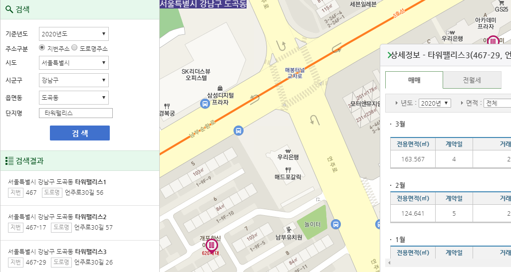 여기서 아래의 검색결과를 클릭해보면 즉각적으로 2020년도의 거래된 내용에 대해서 자세히 확인이 가능한데요. 전용면적, 계약일, 거래금액, 층, 건축년도, 도로조건, 전산공부 등에 대해서 자세히 나오더라구요. 왠지 매매가격이 바로 공개되었는데 이곳에서 직접적으로 거론하는게 적절한지는 의문이 들어서 일단 가려놨습니다만 타워팰리스 역시 부자들이 사는곳 답게 가격이 꽤 나가더라구요.