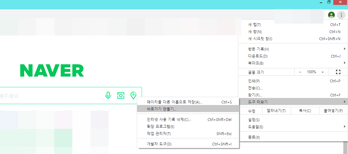네이버 메일 바로가기 생성을 크롬 기준으로 설명해 드리자면 우측 상단에 세계의 점을 클릭하신 뒤에 "도구 더 보기"를 선택하시고 그 내부에 보이는 "바로가기 만들기" 버튼을 누르면 해당 사이트가 바탕화면에 바로 갈 수 있도록 설치가 되니 언제든지 이용하실 수 있습니다.