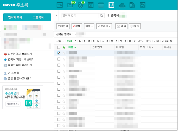 그럼 아래와 같은 주소록이 나오는 데요. 이곳에서 체크하여 삭제하거나 수정하는 것이 가능합니다. 네이버 메일 주소록 삭제 매우 간단하니 누구나 따라 해보시면 하실 수 있다고 생각합니다.
